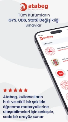 Kullanıcı dostu, sade arayüzü sayesinde Atabeg'de kurumunuzu, bakanlığınızı veya müdürlüğünüzü seçerek katılmak istediğiniz sınav eğitimine kolayca erişirsiniz. Reklamsız bir deneyimle kesintisiz öğrenmenin keyfini çıkarın. Sınav sonrası "Sözlü Mülakat" süreçlerinizde de yanınızda olan Atabeg, "Duyurular ve Haberler" bölümüyle sizi en yeni gelişmelerden anında haberdar eder. Atabeg, bağımsız bir girişim olarak, kamu kurum ve kuruluşlarıyla doğrudan bir bağlantısı olmaksızın, siz değerli kamu personelinin görevde yükselme hedeflerine ulaşmasında etkili ve verimli bir destek sağlamayı amaçlamaktadır. Atabeg ile hedeflerinize emin adımlarla ilerleyin, zaman ve enerjiden tasarruf ederek kariyer yolculuğunuzda fark yaratın.