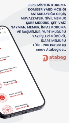 Atabeg, sizi gereksiz bilgilerle yormadan, kurumunuzun yalnızca sorumlu tuttuğu konulara yönlendirir. Güncel mevzuat bilgilerini, kısa ve öz konu anlatımlarını, sesli destekleri, her konuya özel tarama testlerini ve deneme sınavlarını tek bir platformda buluşturur. Hatalı yanıtladığınız soruları "Tekrar Çöz" özelliğiyle pekiştirerek kalıcı öğrenmeyi garantiler. Emniyet Genel Müdürlüğü personeli için Misyon Koruma, Jandarma ve Sahil Güvenlik personeli için JSPS gibi kritik sınav alanları veya Diyanet İşleri Başkanlığı'ndaki Şef, Vaiz, Murakıp, Şube Müdürü ve Adalet Bakanlığı'ndaki 2. Müdür, İnfaz Koruma Memuru gibi yükselme basamaklarına özel hazırlanmış içeriklerle, başarıya giden yolda size rehberlik eder. Kişiselleştirilmiş güncel bilgiler ve bilgi kartları ile her an bir adım önde olun.