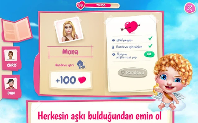 Bu aşk hikayesi oyununda tatlı küçük Cupid olarak binlerce kişinin ilk öpücüğünü deneyimlemesine yardım et. Çöpçatan melek olup müşterilerini dans dersleri, öpüşme eğitimleri ve kıyafetlerle gerçek aşka hazırla. Onların randevularını unutulmaz bir öpücükle taçlandırmalarını sağla!